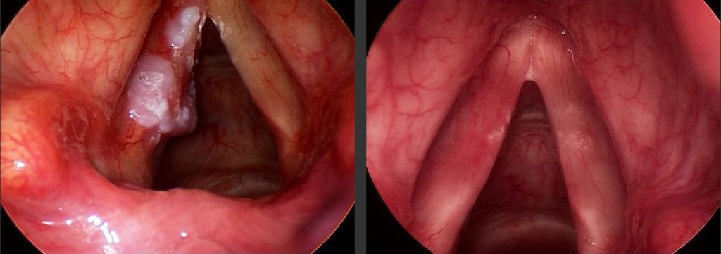 Bệnh nhân Đ.V.Gái, nam, 70 tuổi, địa chỉ tại Vĩnh Long, có tiền sử hút thuốc lá 45 gói/năm, khàn tiếng kéo dài hơn 5 tháng. Bệnh nhân đến khám và nội soi tại phòng khám 22 Khoa Ngoại chuyên khoa Bệnh viện Quân dân y Miền Đông, được phát hiện khối u sùi khu trú ở cuối dây thanh trái, dây thanh di động tốt. Nội soi treo vi phẫu thanh quản cắt u làm giải phẫu bệnh với kết quả: Carcinoma tế bào gai tại chỗ. Bệnh nhân được chẩn đoán là ung thư dây thanh trái, giai đoạn I với phân loại cTNM là T1aN0M0, nên được chỉ định cắt dây thanh trái và nạo vét hạch cổ cùng bên gửi giải phẫu bệnh. Bệnh nhân được chỉ định cắt u dây thanh trái với ranh giới an toàn qua nội soi và tái tạo dây thanh bằng niêm mạc tại chỗ, bảo tồn chức năng nói cho bệnh nhân sau mổ và nạo vét hạch vùng cổ cùng bên gửi giải phẫu bệnh. Lấy bỏ bệnh phẩm khối u và sinh thiết tại 2 vị trí: mép trước dây thanh đối bên (bên phải) và hạch vùng cổ cùng bên nhằm đánh giá phân độ, tiên lượng sau mổ, cũng như đưa ra hướng xử trí tiếp theo. Theo dõi hậu phẫu: vết mổ liền tốt, bệnh nhân nói được, dây thanh còn lại di động tốt.