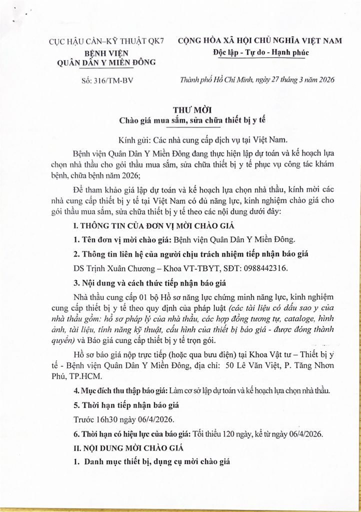 Trang chủ › Thông báo - Văn bản › THƯ MỜI CHÀO GIÁ 16 lượt xem 02/04/2026 Thông báo - Văn bản Thông báo - Văn bản THƯ MỜI CHÀO GIÁ Posted on 02/04/202602/04/2026 by Nguyen Hang 02 Apr Nguyen Hang Viêm não mô cầu – Mức độ nguy hiểm và cách phòng bệnh THƯ MỜI CHÀO GIÁ Bài viết cùng chuyên mục: THƯ MỜI CHÀO GIÁ BỆNH VIỆN QUÂN DÂN Y MIỀN ĐÔNG THÔNG BÁO TUYỂN DỤNG THƯ MỜI CHÀO GIÁ THƯ MỜI CHÀO GIÁ