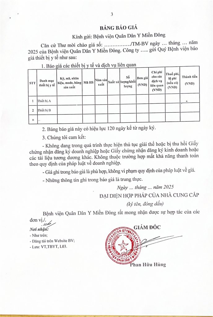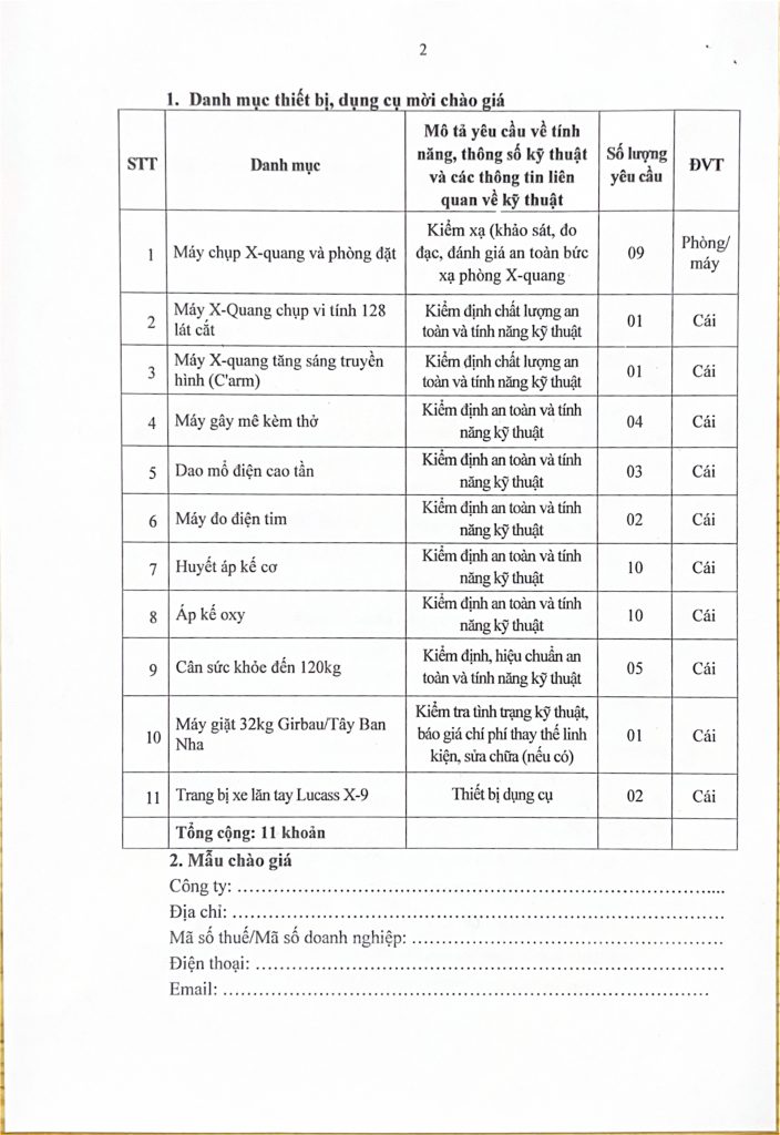 Trang chủ › Thông báo - Văn bản › THƯ MỜI CHÀO GIÁ 14 lượt xem 27/11/2025 Thông báo - Văn bản Thông báo - Văn bản THƯ MỜI CHÀO GIÁ Posted on 27/11/2025 by Nguyen Hang 27 Nov Nguyen Hang Hội nghị Tổng kết công tác bệnh viện năm 2025 và phương hướng, nhiệm vụ năm 2026 Bài viết cùng chuyên mục: THƯ MỜI CHÀO GIÁ THÔNG BÁO TUYỂN DỤNG THƯ MỜI BÁO GIÁ THƯ MỜI CHÀO GIÁ