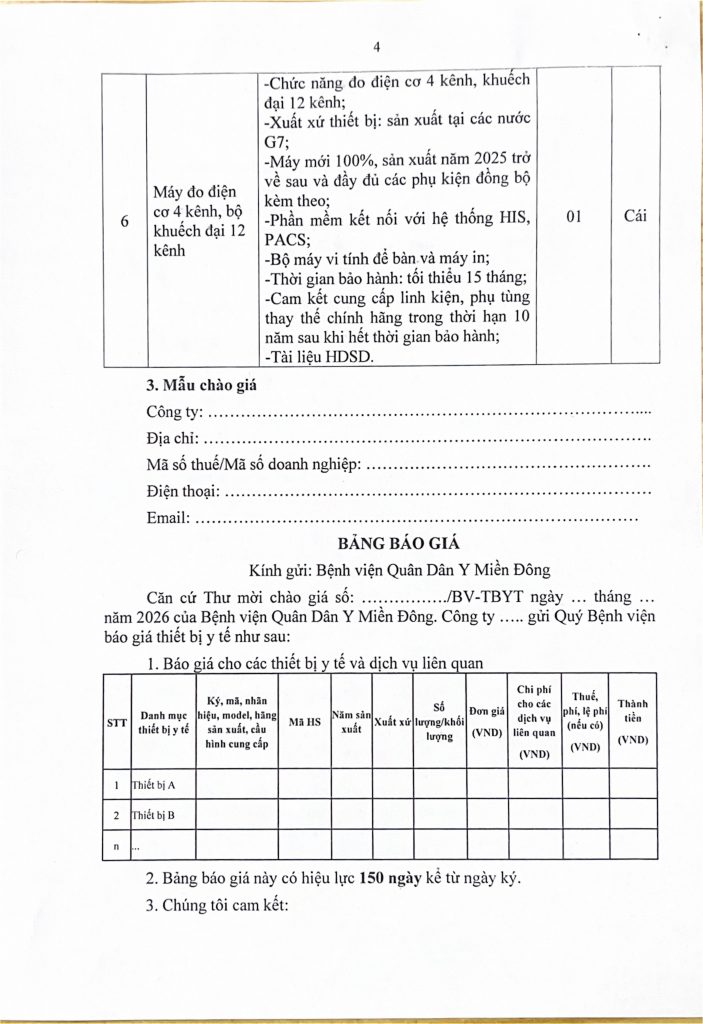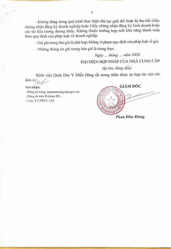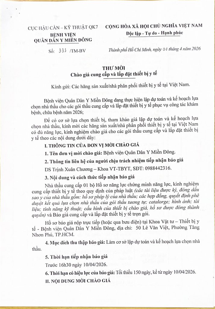 Trang chủ › Thông báo - Văn bản › THƯ MỜI CHÀO GIÁ 49 lượt xem 02/04/2026 Thông báo - Văn bản Thông báo - Văn bản THƯ MỜI CHÀO GIÁ Posted on 02/04/2026 by Nguyen Hang 02 Apr Nguyen Hang THƯ MỜI CHÀO GIÁ Tình hình dịch bệnh tay chân miệng 3 tháng đầu năm 2026 và các biện pháp phòng bệnh Bài viết cùng chuyên mục: THƯ MỜI CHÀO GIÁ BỆNH VIỆN QUÂN DÂN Y MIỀN ĐÔNG THÔNG BÁO TUYỂN DỤNG THƯ MỜI CHÀO GIÁ THƯ MỜI CHÀO GIÁ