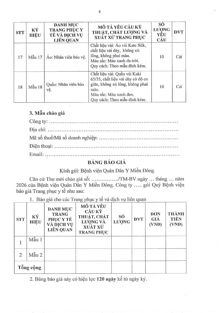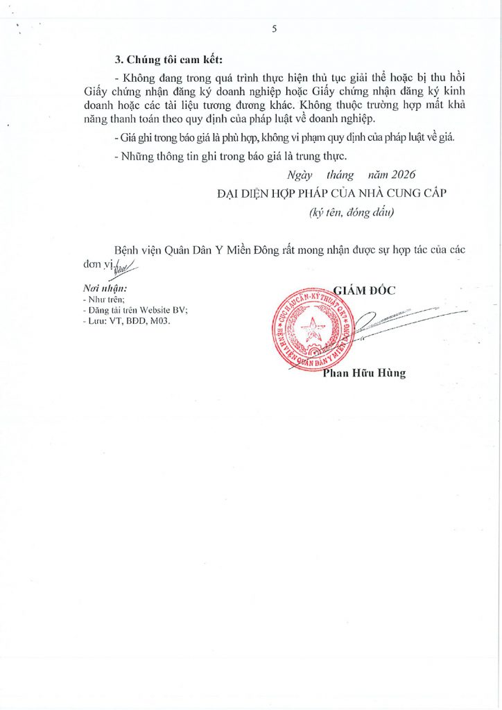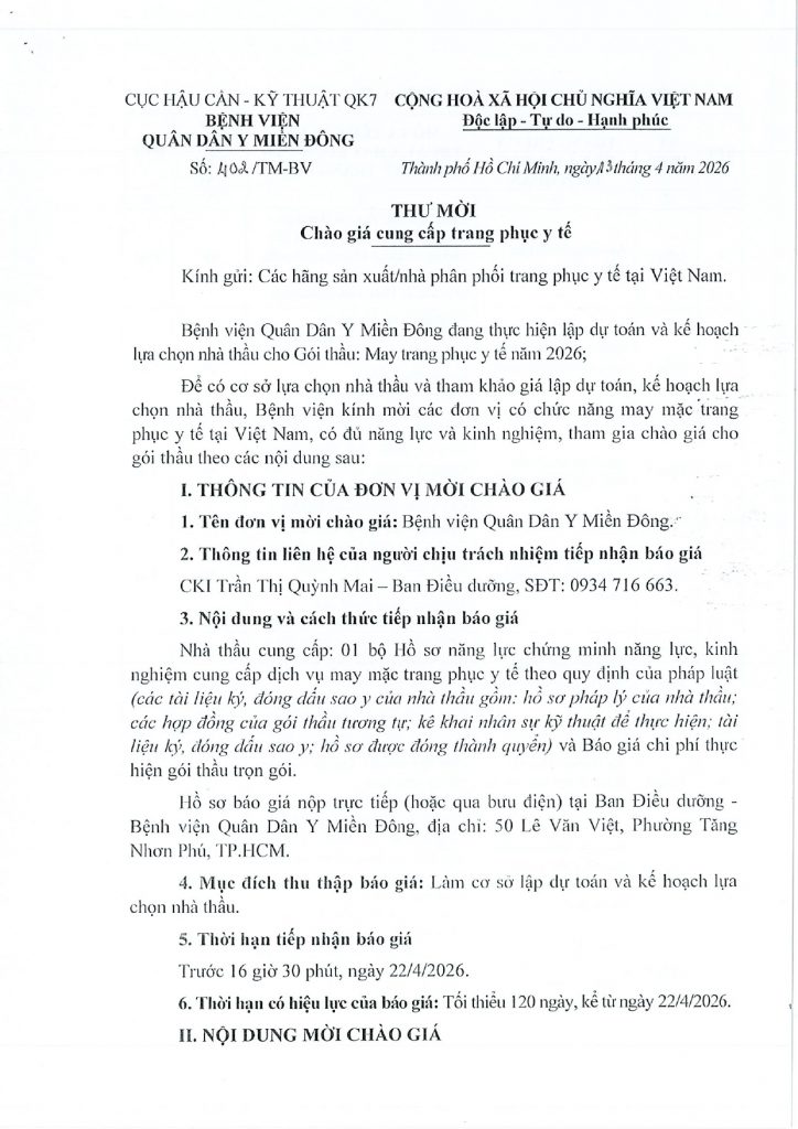 Trang chủ › Thông báo - Văn bản › THƯ MỜI CHÀO GIÁ 24 lượt xem 14/04/2026 Thông báo - Văn bản Thông báo - Văn bản THƯ MỜI CHÀO GIÁ Posted on 14/04/202614/04/2026 by Nguyen Hang 14 Apr Bệnh viện Quân Dân Y Miền Đông gửi Thư mời chào giá cung cấp trang phục y tế, nội dung cụ thể như sau: Nguyen Hang Phẫu thuật nội soi cắt bán phần dưới dạ dày, vét hạch D2 thành công Bài viết cùng chuyên mục: THƯ MỜI CHÀO GIÁ THƯ MỜI CHÀO GIÁ BỆNH VIỆN QUÂN DÂN Y MIỀN ĐÔNG THÔNG BÁO TUYỂN DỤNG THƯ MỜI CHÀO GIÁ
