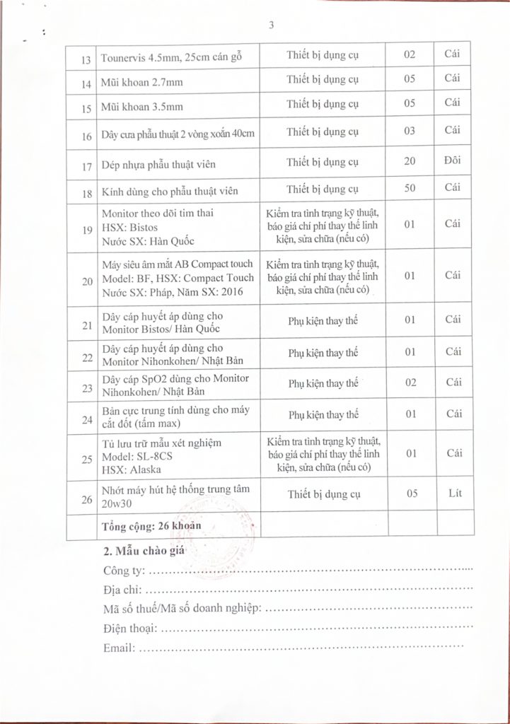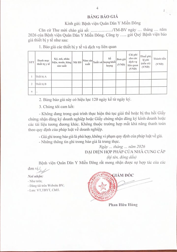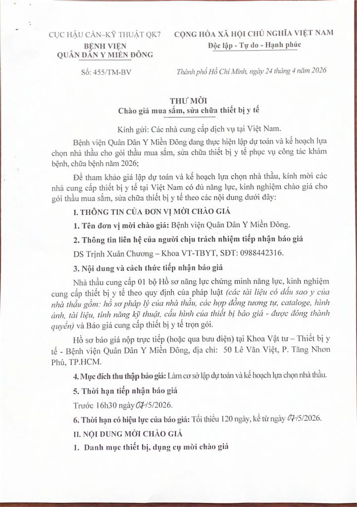 Trang chủ › Bản tin bệnh viện › THƯ MỜI CHÀO GIÁ 12 lượt xem 24/04/2026 Bản tin bệnh viện Bản tin bệnh viện THƯ MỜI CHÀO GIÁ Posted on 24/04/202624/04/2026 by Nguyen Hang Nguyen Hang THƯ MỜI CHÀO GIÁ KẾ HOẠCH NĂM 2026 Bài viết cùng chuyên mục: Bệnh viện Quân Dân Y Miền Đông khám bệnh, cấp thuốc và tặng quà cho 400 người dân tỉnh Đồng Nai Sinh hoạt chuyên môn: Cập nhật chẩn đoán, điều trị, dự phòng bệnh não mô cầu và Chia sẻ thực hành từ Phòng Tiêm chủng Bệnh viện Quân Dân Y Miền Đông Phẫu thuật nội soi thành công mở ống mật chủ lấy sỏi dưới hướng dẫn của ống soi mềm đường mật Lan tỏa yêu thương – Tiếp thêm nghị lực sống cho bệnh nhân suy thận có hoàn cảnh đặc biệt khó khăn