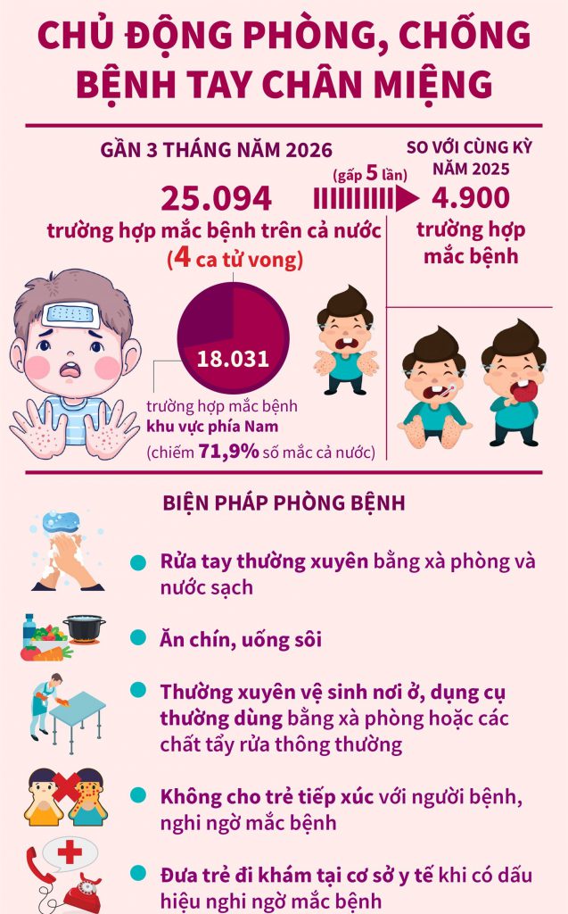 Theo hệ thống giám sát bệnh truyền nhiễm, cả nước ghi nhận 25.094 trường hợp mắc bệnh tay chân miệng (4 ca tử vong) trong gần 3 tháng đầu năm 2026, cao hơn 5 lần so với cùng kỳ năm 2025 (4.900 trường hợp bệnh). Trong đó riêng khu vực phía Nam ghi nhận 18.031 trường hợp (chiếm 71,9% số mắc cả nước). Số trường hợp mắc bệnh tay chân miệng chủ yếu ở trẻ dưới 10 tuổi, trong đó hay gặp ở nhóm 1-5 tuổi, tuổi đi nhà trẻ và mẫu giáo. Để chủ động và tăng cường công tác phòng, chống bệnh tay chân miệng trong thời gian tới, Cục Phòng bệnh, Bộ Y tế đề nghị Sở Y tế các tỉnh, thành phố tăng cường các hoạt động truyền thông giáo dục sức khỏe phù hợp tới người dân về các biện pháp phòng, chống bệnh tay chân miệng.